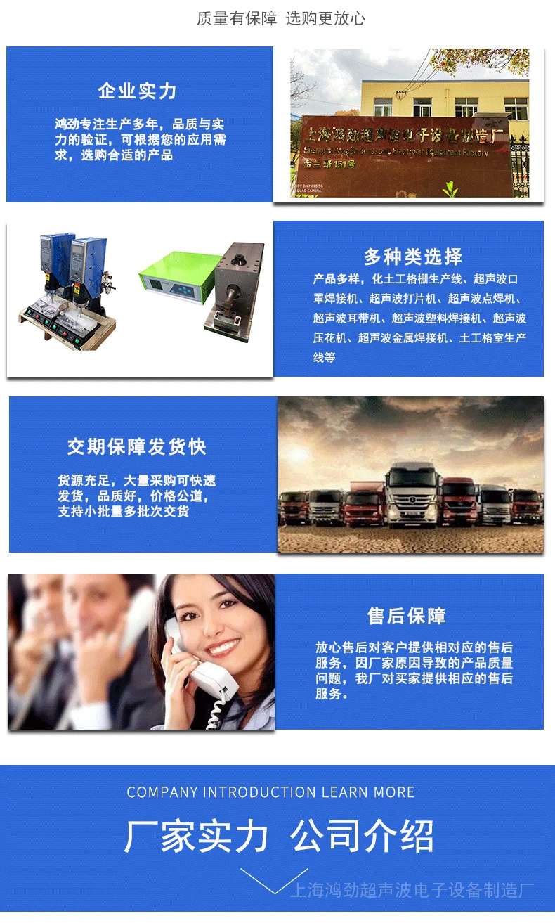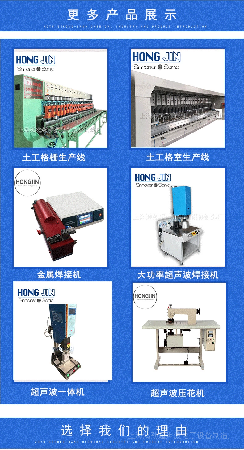 我公司制造土工格室生产线设备,是由多台超声波塑料焊接机组合而成采用进口PLC控制具有 如 下先进特点:1、触摸屏显示及参数设定,原装进口压电陶瓷换能器,输出强劲稳定。